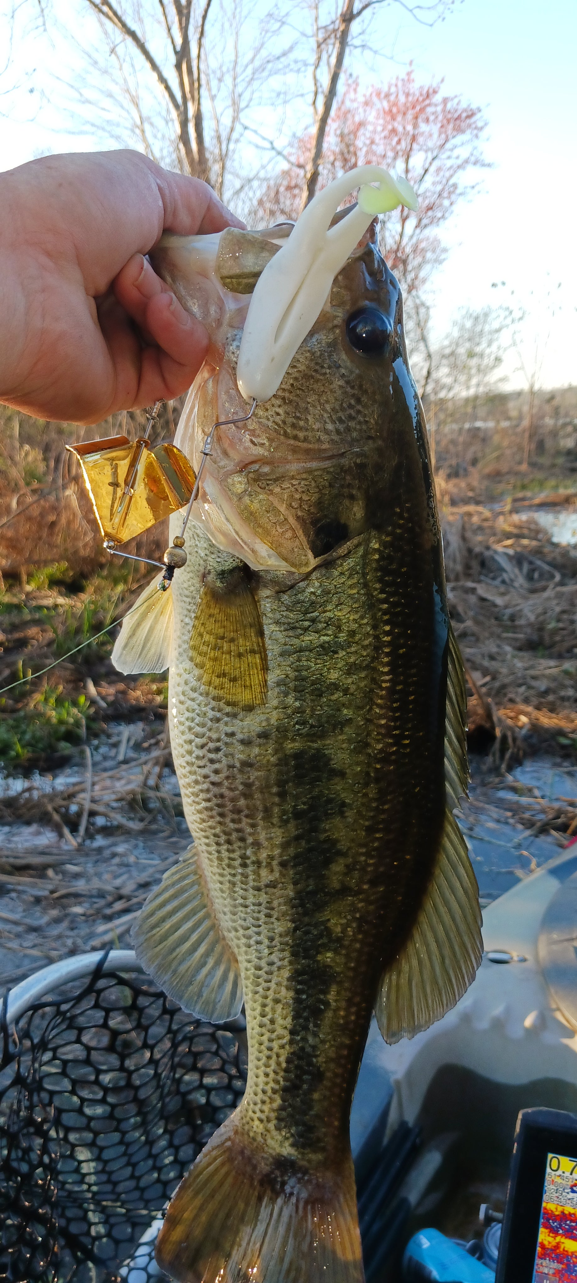 1st buzzbait Bass of the year... Going down the bank, a bass swirled about 20' in front of me.. made the cast and BLOOSH... Fish on.!!! . I forgot how much I loved that topwater blow-up.!