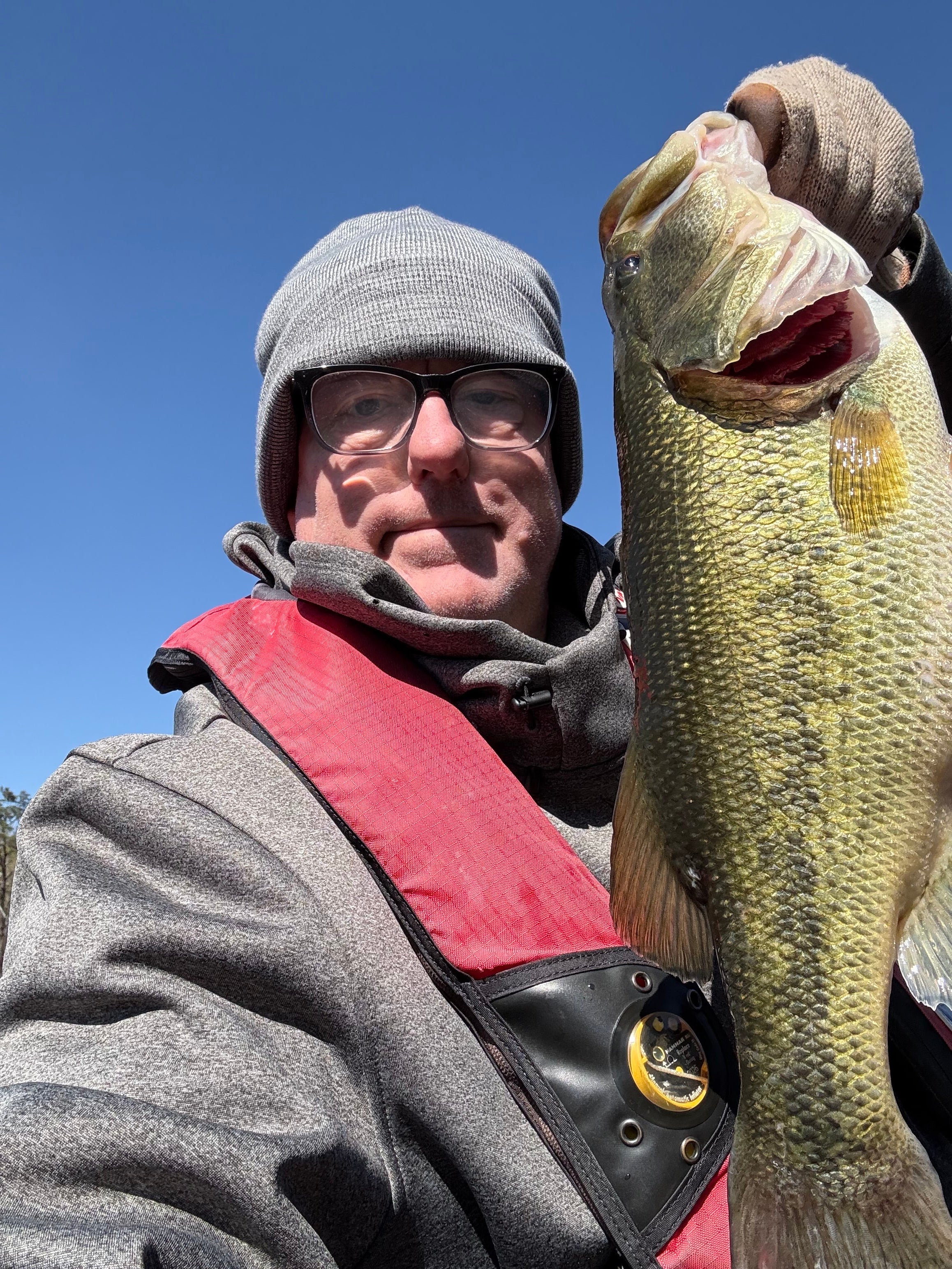 Air temps in the 40’s with 20-30 mph winds and I’m all bundled up. Bass don’t react like humans do to weather someone once said. Sometimes you just need to run a Chatterbait over the emerging lily pads. Caught 13 today, biggest fish weighted 4.68 lbs. 😀