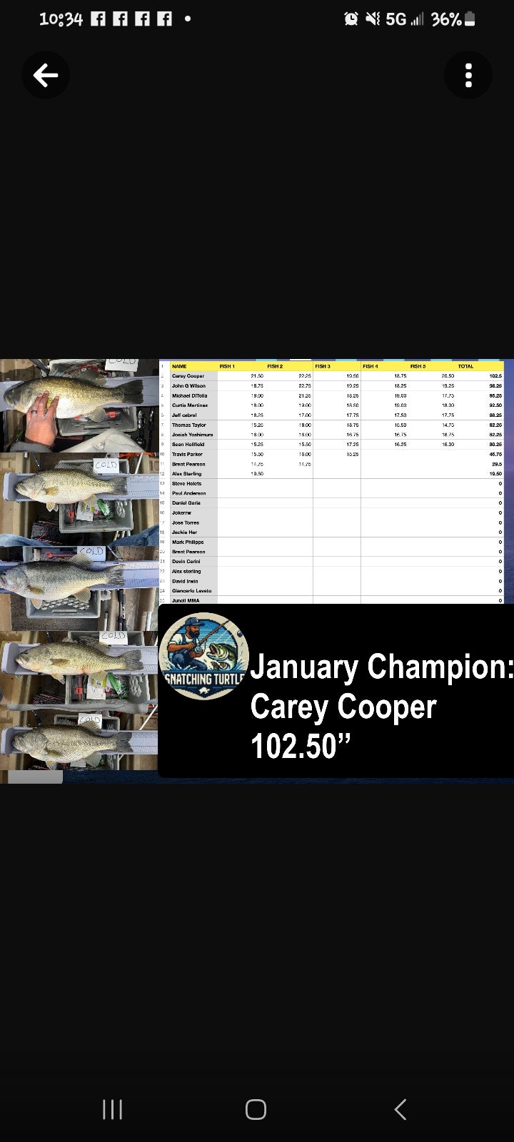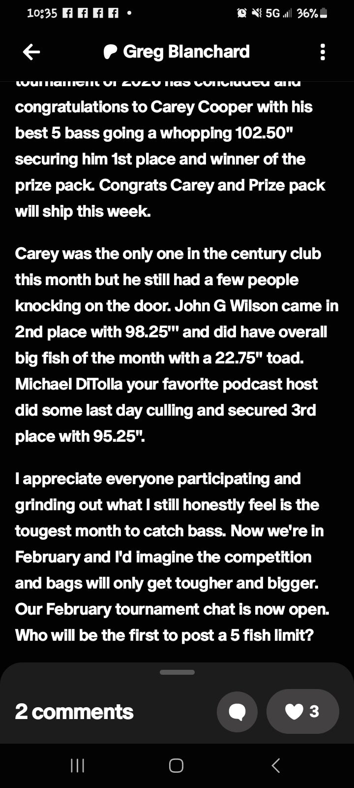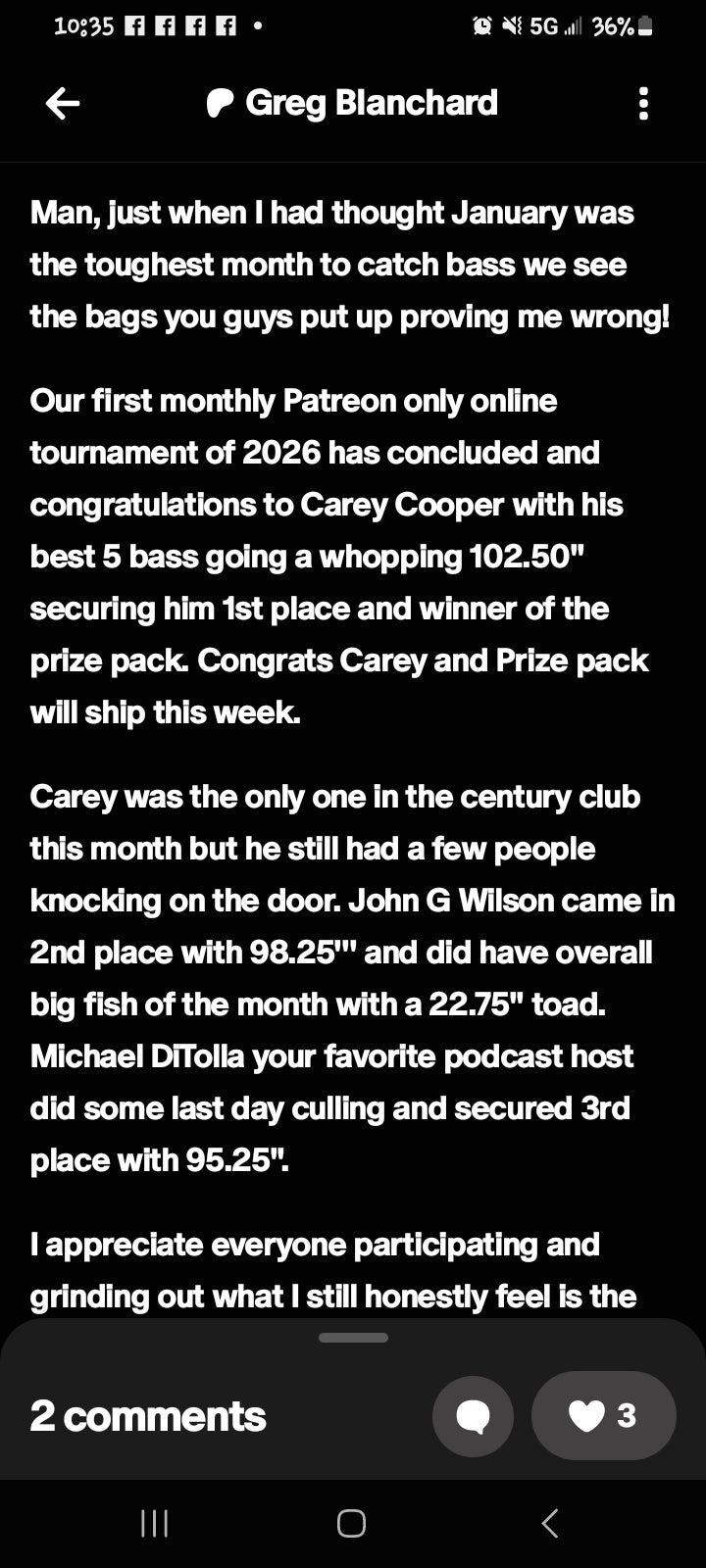 Took 2nd place in Greg Blanchard's January monthlong nationwide tournament..! And won Big Bass award with a 22.75" largemouth..!!