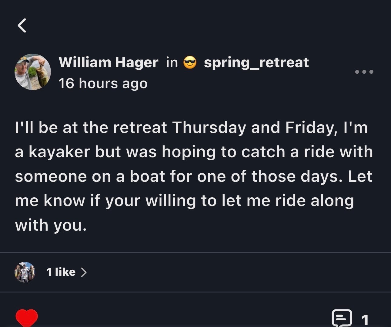 Will is looking for a boater to pair up with for the retreat! Shoot him a message if you have a empty seat!