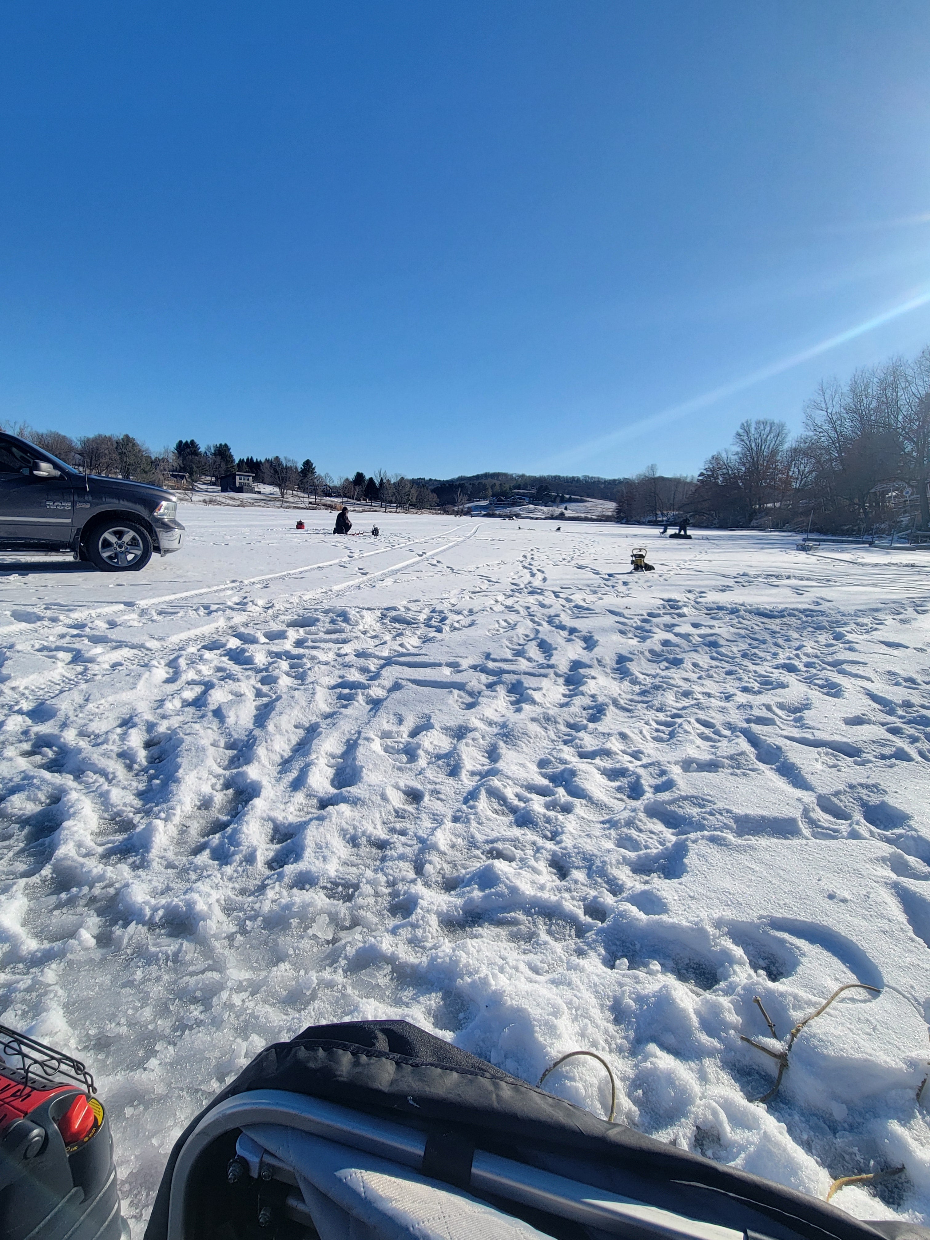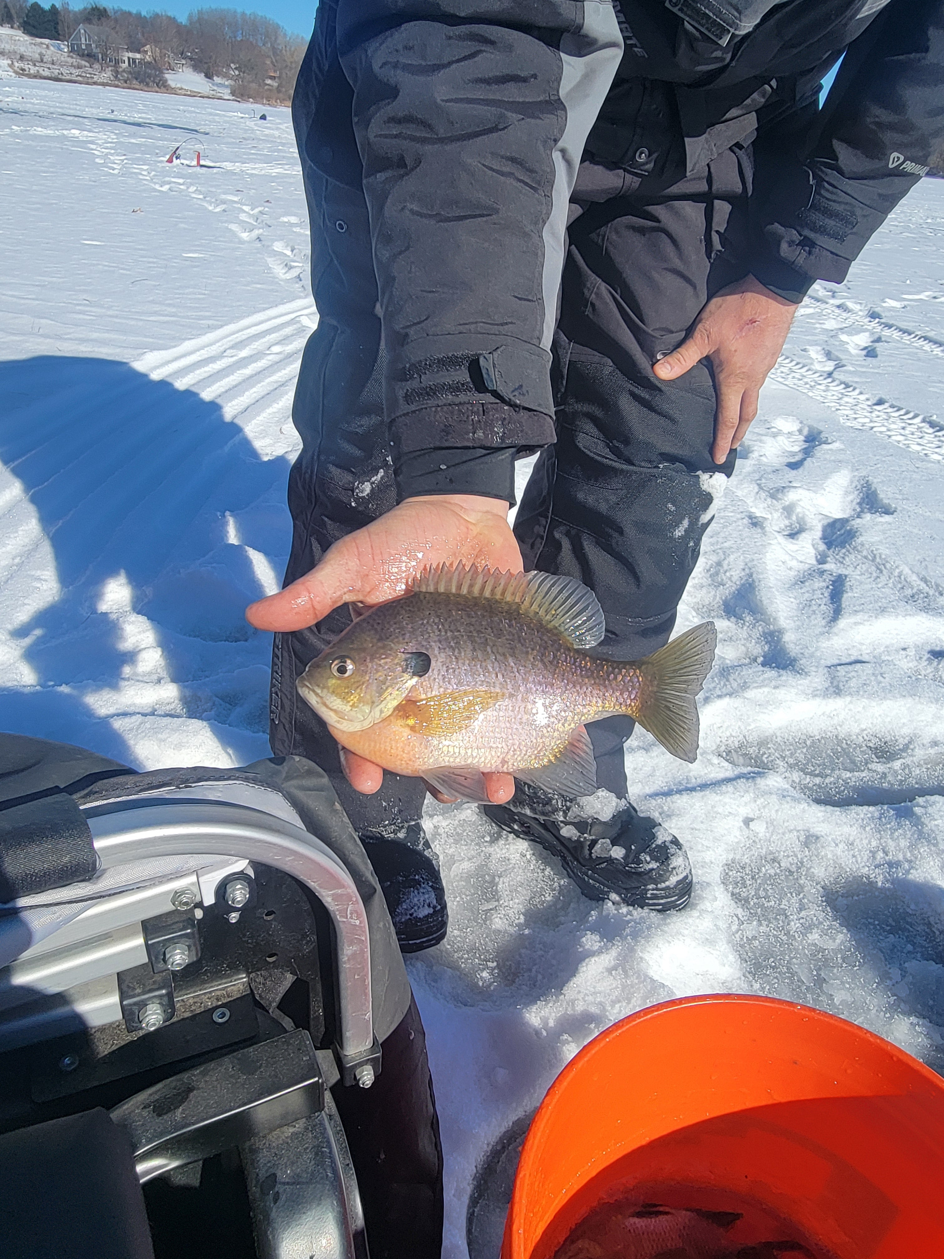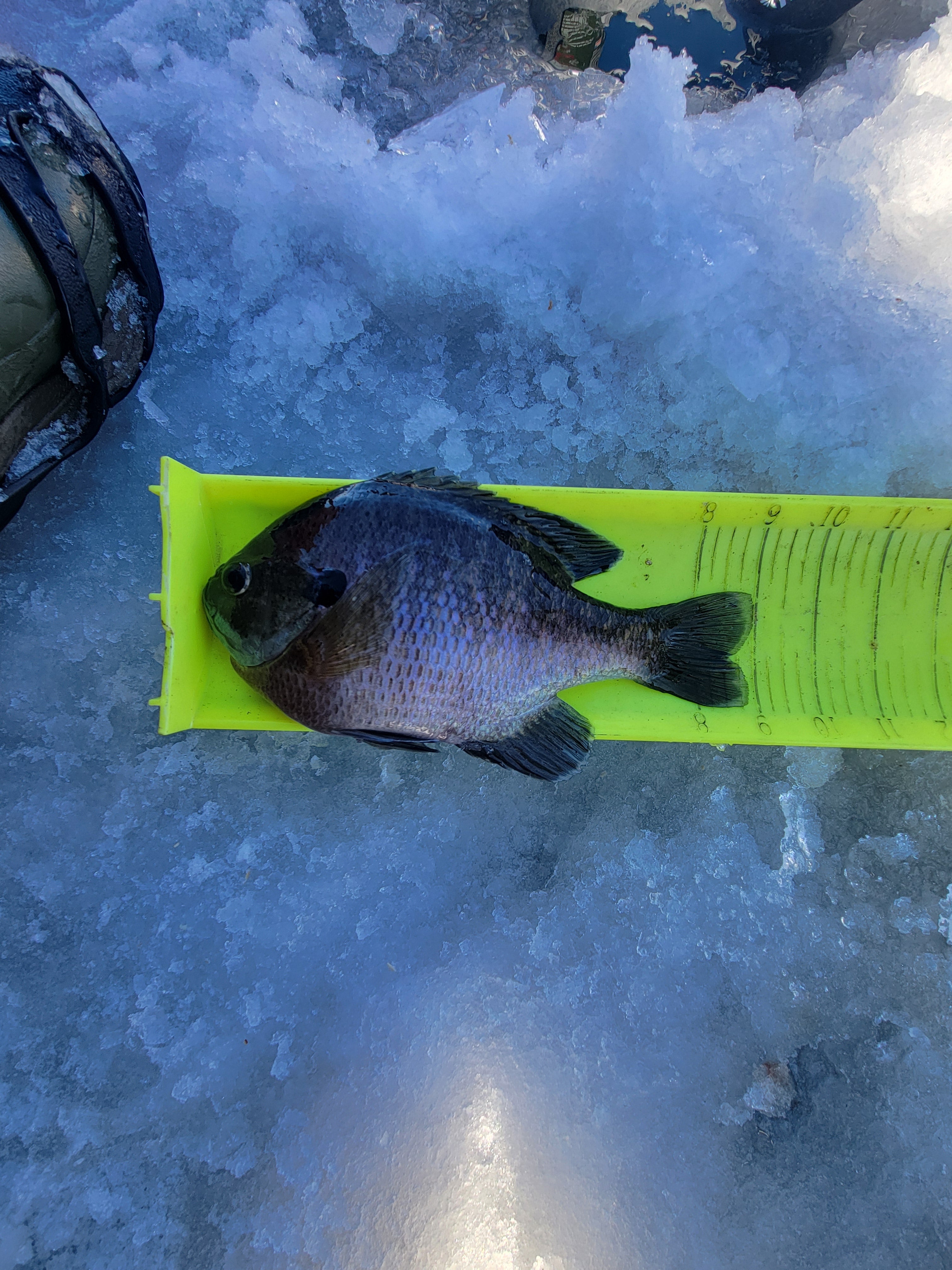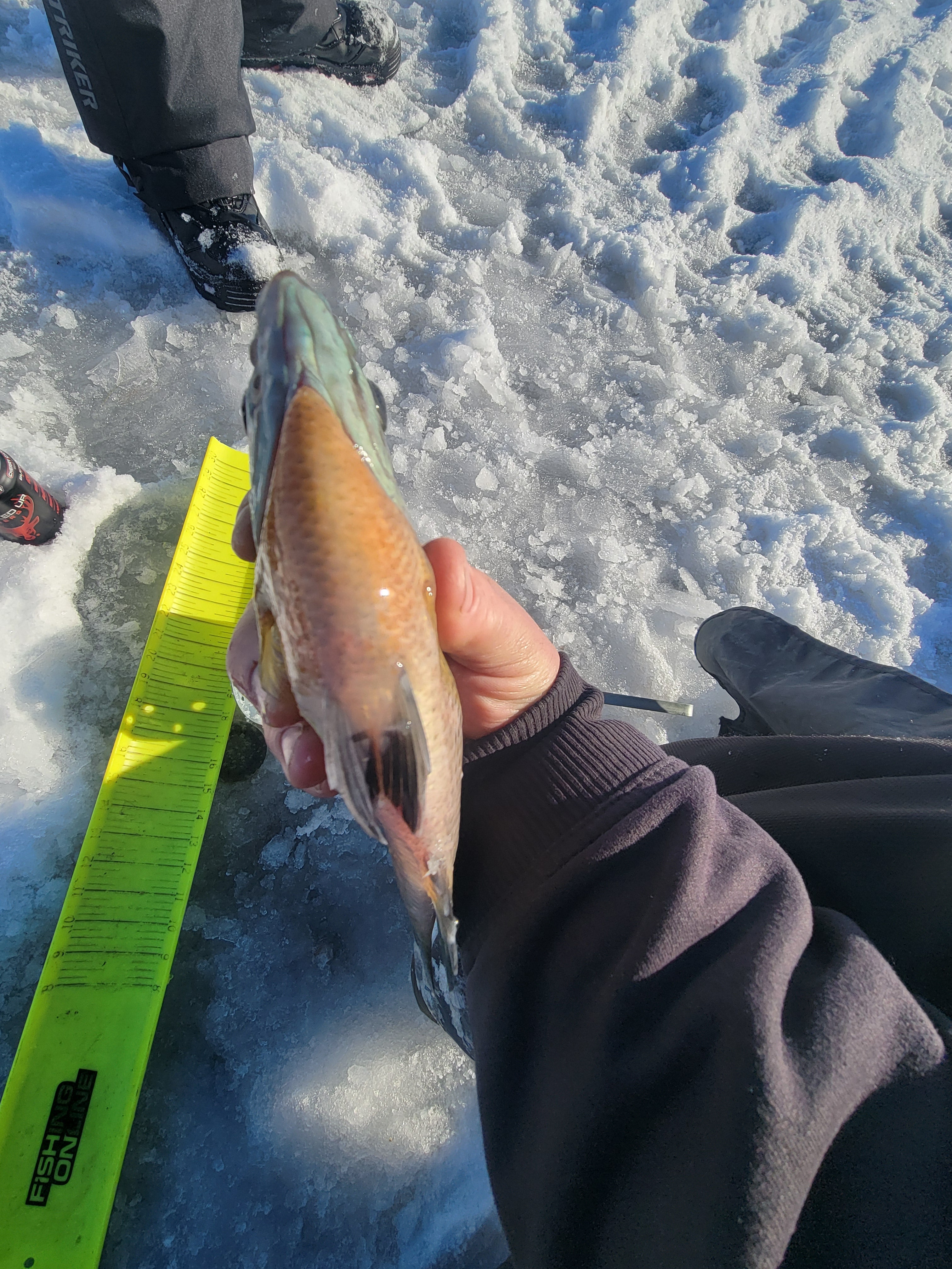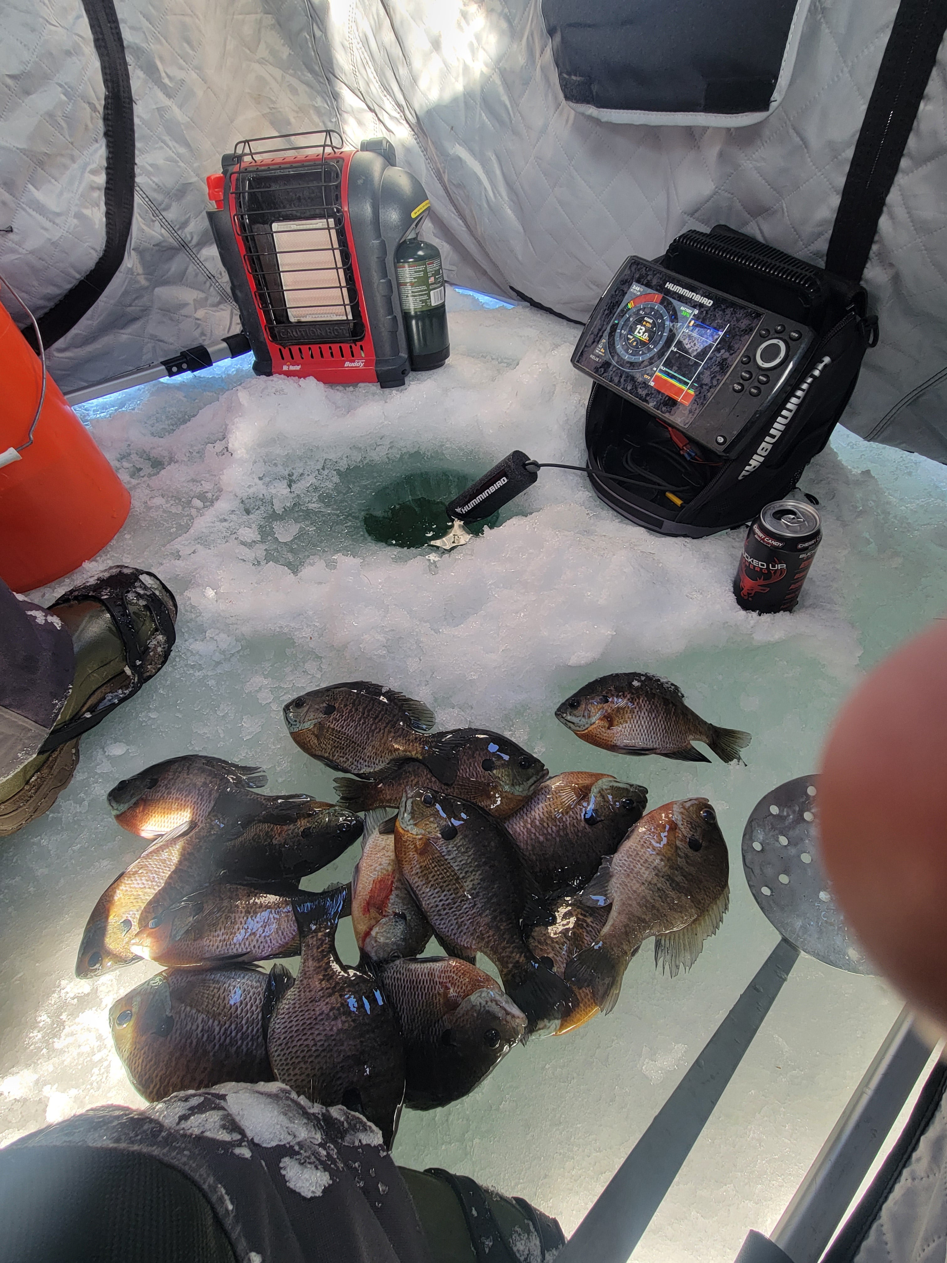 We got a break!! It's in the teens today people.. Suns out, blue bird sky's, and the ice is safe to drive on after a week and a half of negative temps and the windchill has been something else. Burrrr!!! My cousin, a friend of his and myself got into some really nice gills today, we kept 17. Some of these gills where so thick, they must be eating alright! (second picture) Got one small bass on a tip down, that was cool. First bass I've seen in person I think since the beginning of this last Nov. maybe? All made for a realy nice day in my book, fun stuff!