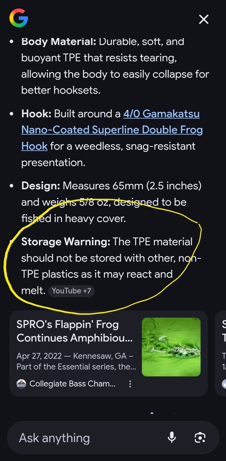 I learned the hard way about z-man and plastics.. even the Spro flapping frog will melt if it mixes with other plastics